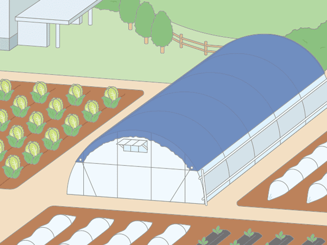 • 農業用ハウスの構造は、台風に負けない強度や耐久性、コストなど様々なことが求められます。ハウス内の施設では、植物の生育を促進するため、遮光資材や潅水資材、暖房装置などが利用されています。