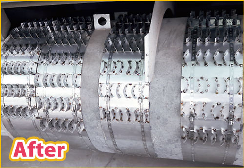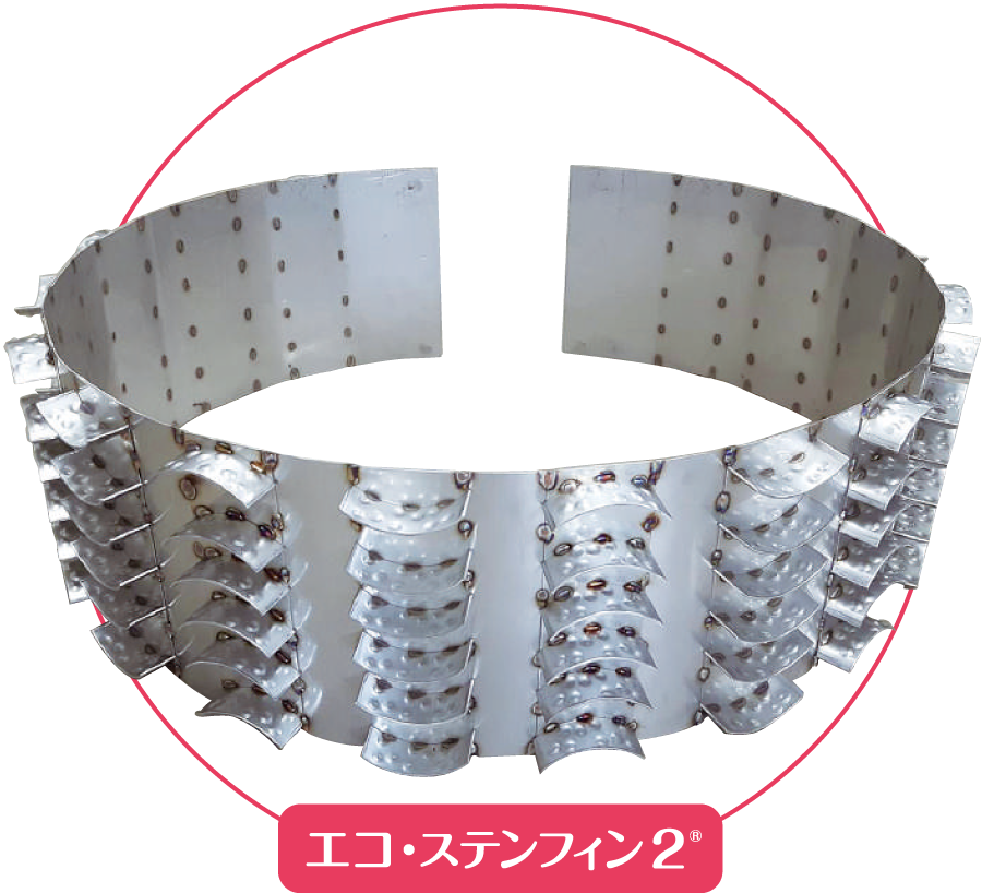 温室や乾燥のための加温機(暖房機)缶体に、多数のフィン(羽)を持ったエコ・ステンフィン2を巻き付けることにより、缶体の表面積の拡大と蓄熱効果の向上で、吸引された空気が温まりやすく、エネルギー効率が高まります。