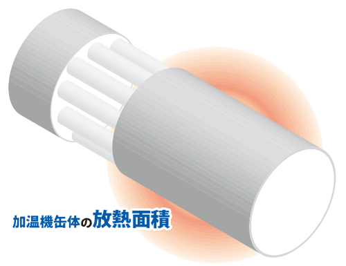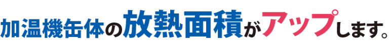 熱効率を向上させる手段の一つとして、加温機缶体の放熱面積をアップさせるが重要です。エコステンフィン2を1枚取り付けた場合は約25%、3枚取り付けた場合は約75%の放熱面積がアップします。熱交換が行われる表面積が多いほど、フィンに触れた空気の温度が上がり、送風される空気全体の温度が高まります。