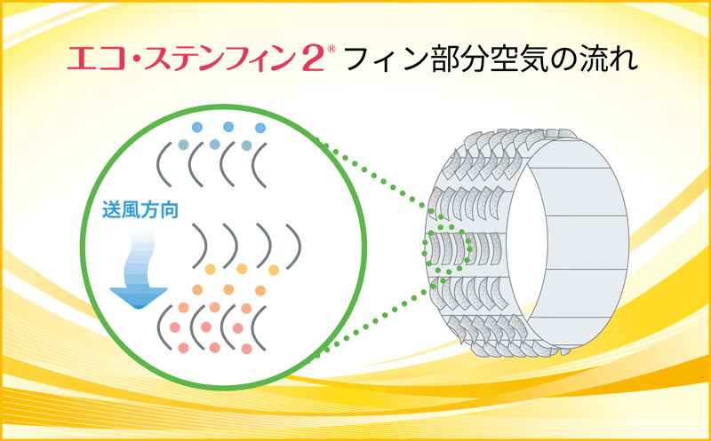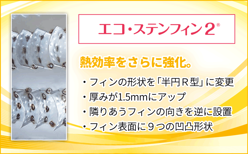 従来品のフィン(羽)形状は「くの字型」でしたが、新タイプの【エコ・ステンフィン2】は、空気の流れと熱効率を向上させた「半円R型」に進化。
