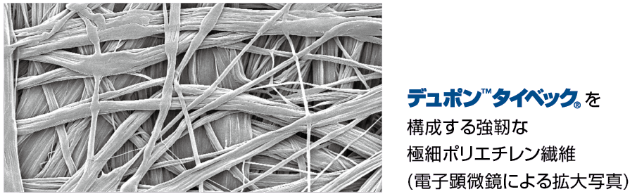 素材に使用しているデュポン™タイベック®は、0.5~10ミクロンのポリエチレンの極細長繊維に熱と圧力を加えて結合させたシート(不織布)です。耐水性に富み、透湿性と通気性も兼ね備え、耐久性にも優れています。