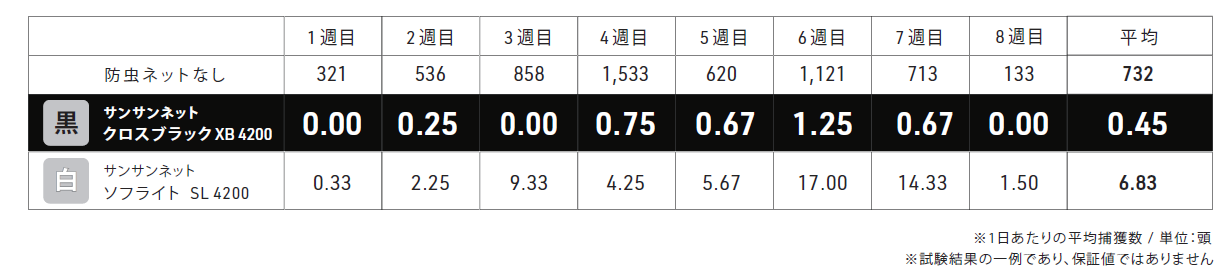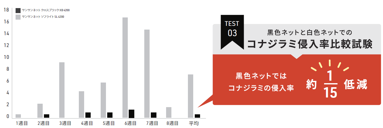 - 白色0.4㎜の従来品に比べ、コナジラミの侵入率1/15に低減!