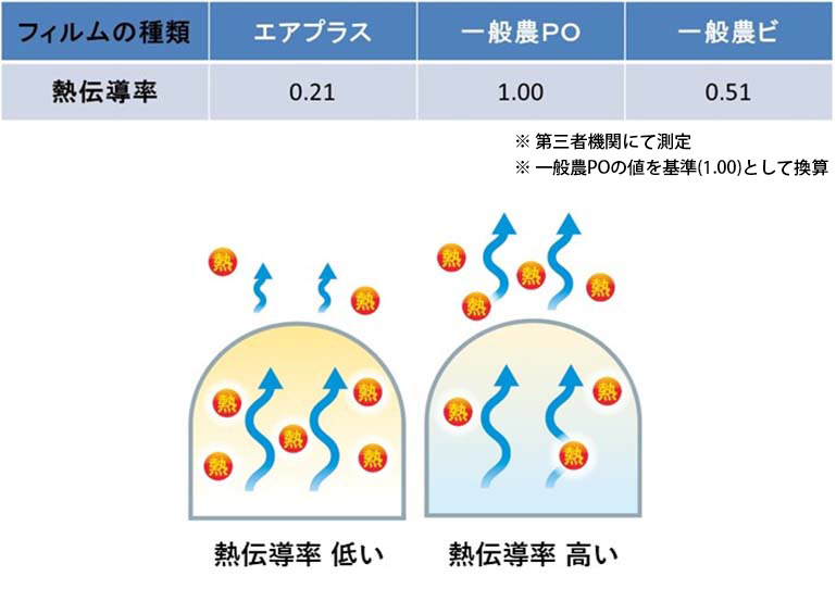 空気の断熱性により、保温性に優れています。加温ハウスの場合は、暖房燃料消費量の削減が期待できます。