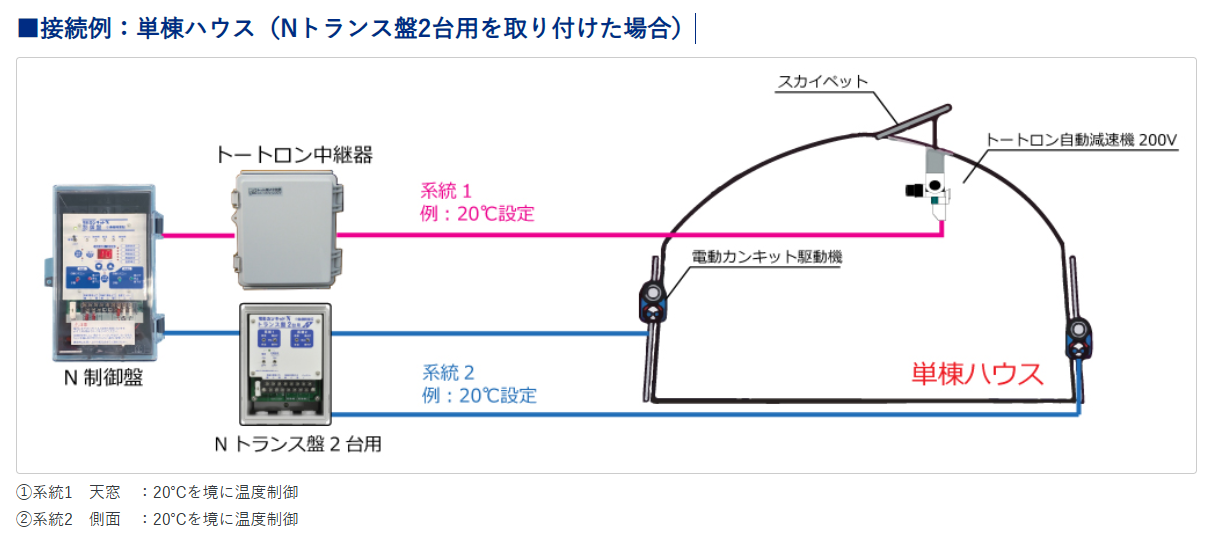 『N制御盤』に『トートロン中継器』と別に『Nトランス盤』を接続することができ、側面の自動換気と天窓の自動換気をトータル制御することが可能となります。