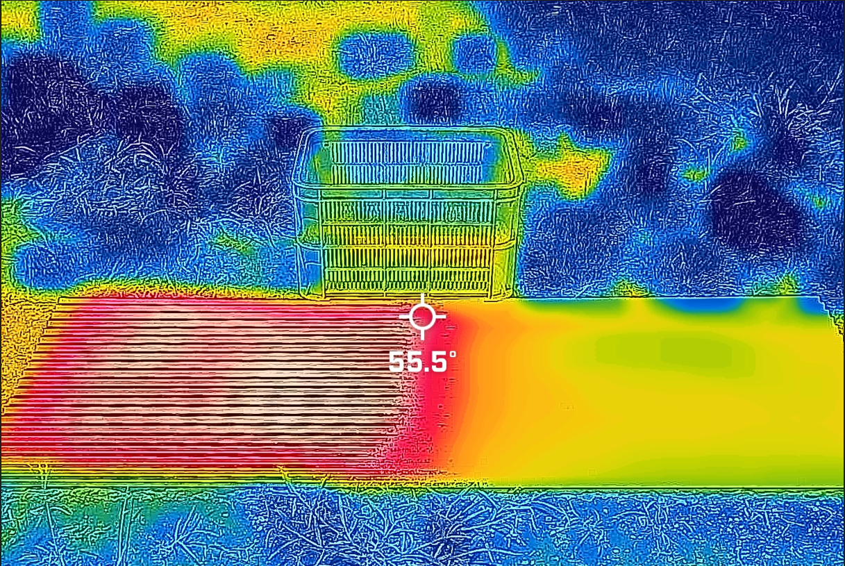 建物への熱の伝達を減らし屋根の温度上昇を抑えます。高温対策を行う上で、太陽光による屋根面の温度上昇の影響はとても大きいです。屋根の表面は日射により最大で50℃上昇し、70~90℃に達することがあります。一方 で、COOL-FXを塗布した屋根は、昼間の気温から5-14℃しか上昇しません。
