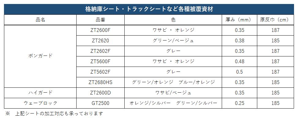 • 倉庫など被覆材、トラックカバー、野積みシートなど使用用途は多岐に渡ります。
