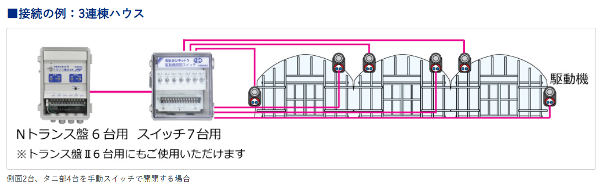 (※開閉スイッチ7台用を使用する場合は、Nトランス盤2台用(もしくはNトランス盤4台用・Nトランス盤6台用)と接続して使用します。開閉スイッチ7台用1台で制御できる駆動機の台数は7台までです。)